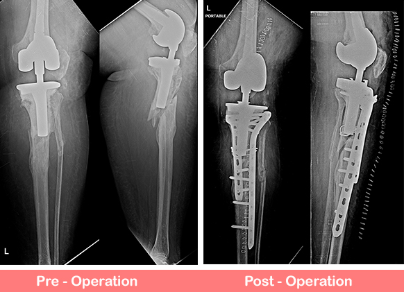 • A fracture in the bone around the implant (such as the femur or tibia) can compromise the stability of the knee replacement and may require revision surgery.